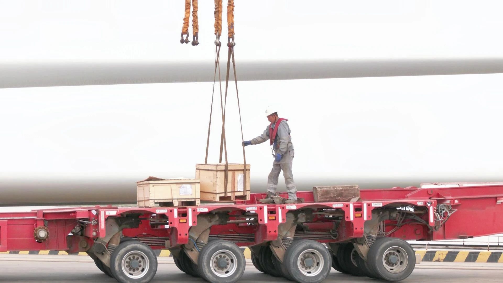 “這批風電葉片發(fā)往上海金山,共計36套,單套長度達110米,目前已完成18套的裝載作業(yè),這是第9船次。我們班組正全力協(xié)作,力爭在6小時內(nèi)完成本船次的裝運任務(wù),確保按時離港。”江蘇鹽城港風電裝備進出口港有限公司生產(chǎn)組二班班長祁正磊介紹道。