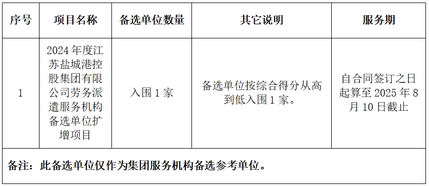 2024年度江蘇鹽城港控股集團有限公司勞務派遣服務機構備選單位擴增項目,包含江蘇鹽城港控股集團有限公司及其子(控)公司的勞務派遣服務。主要服務包括:勞務派遣、崗位外包、人員招聘、績效考核、檔案整理、日常培訓、物業等服務項目。勞務派遣人員主要包括但不限于:物業管理項目負責人、保安、門衛、衛生保潔、會務、前臺、酒店服務員、汽車駕駛員、部分碼頭一線操作工、生產線操作工、顧問等。具體根據項目情況決定。