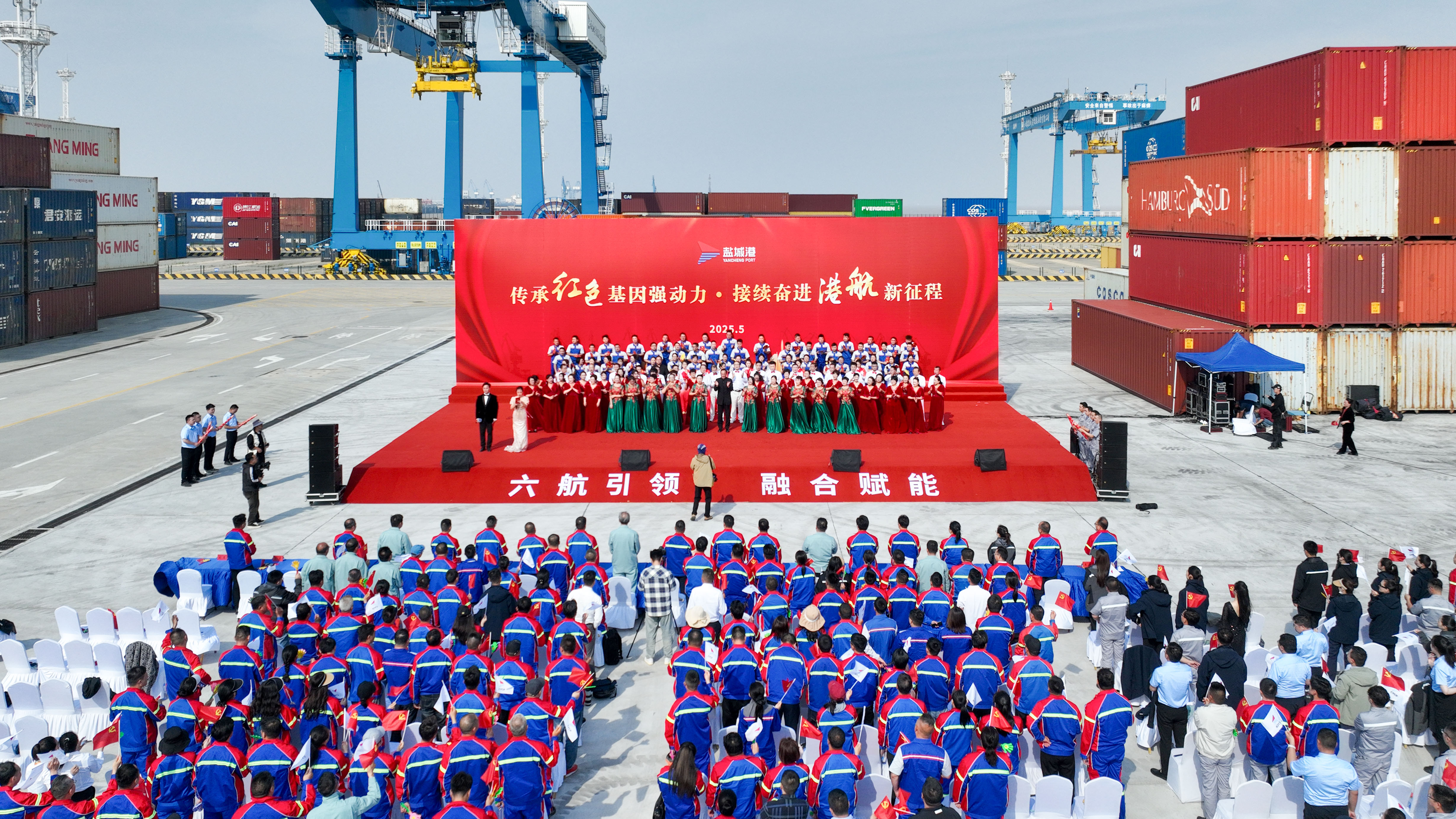 在大豐港區自動化集裝箱堆場,一場別開生面的紅歌與主題曲展演活動正在火熱進行。