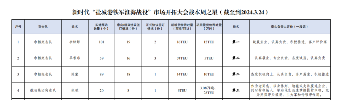自新時代“鹽城港鐵軍淮海戰役”市場開拓大會戰開展以來,航運集團積極響應鹽城港集團黨委號召,成立航運集團突擊隊和巾幗突擊隊,持續深化攬貨拓源,大力弘揚“鐵軍精神”,成功實現市場開拓“新突破”,將定制化、兜底式服務推向了“新高度”。截至目前,累計拜訪客戶308家,簽訂意向協議97份,簽訂正式協議8份,實現新增營收超100萬元,集裝箱走量1008TEU。根據新時代“鹽城港鐵軍淮海戰役”指揮部第二期戰報,航運集團包攬集體前兩名,個人前三名,全力打響“鹽城港鐵軍淮海戰役”市場開拓大會戰第一槍。