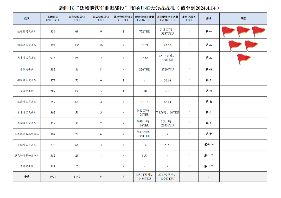 3.簽訂正式協議數量74份:其中響水港區突擊隊16份,巾幗突擊隊11份,航運集團突擊隊9份,大豐港區突擊隊7份,射陽港區突擊隊6份,多式聯運第二突擊隊6份,黨員突擊隊5份,濱海港區突擊隊4份,建湖港區突擊隊3份,阜寧港區突擊隊3份,亭湖港區突擊隊2份,多式聯運第一突擊隊1份,青年突擊隊1份。