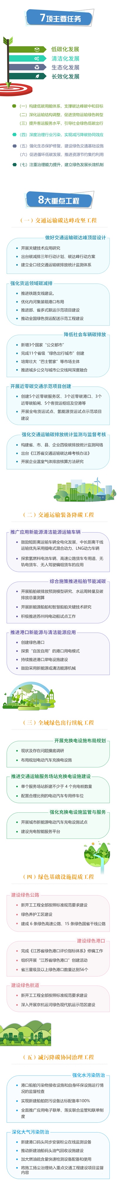 圍繞這4條發展主線,《規劃》提出江蘇綠色交通發展7大主要任務:構建低碳用能體系,支撐碳達峰碳中和目標;深化運輸結構調整,促進貨物運輸綠色轉型;提升客運服務水平,引導社會綠色低碳出行;深度治理行業污染,實現減污降碳協同效應;強化生態保護修復,建設綠色交通基礎設施;促進循環低碳發展,推進資源節約集約利用;注重治理能力提升,建立綠色發展長效機制。