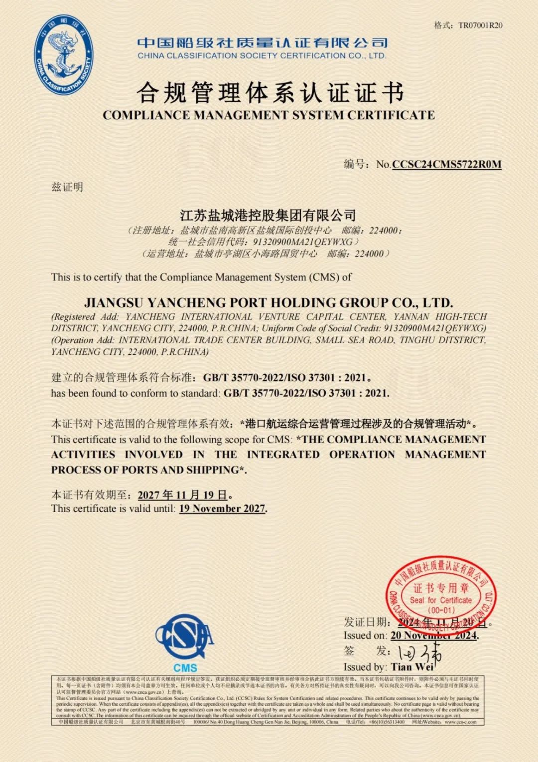 本次合規管理體系認證是由中國船級社質量認證有限公司按照《合規管理體系要求及使用指南》(GB/T35770-2022/ISO 37301:2021)標準,對集團合規管理體系建設情況進行了系統性審查,專家組一致認為鹽城港合規管理體系建設滿足了標準要求。