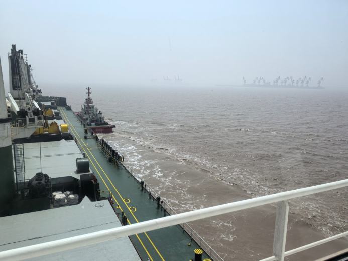 登輪后,引航員迅速通報能見度態(tài)勢,立即啟動應(yīng)急處置流程。指令船舶開啟自動霧號、強化雷達(dá)值守精度、增派專職瞭望人員、播發(fā)航行警報,全程嚴(yán)密監(jiān)測周邊通航環(huán)境。依托豐富的大型船舶引航經(jīng)驗,引航員精準(zhǔn)捕捉短暫的能見度“窗口期”,沉著應(yīng)對西南風(fēng)5級、湍急水流及船舶大吃水等多重考驗,精準(zhǔn)操控船舶轉(zhuǎn)向、調(diào)速,確保航行軌跡始終可控。