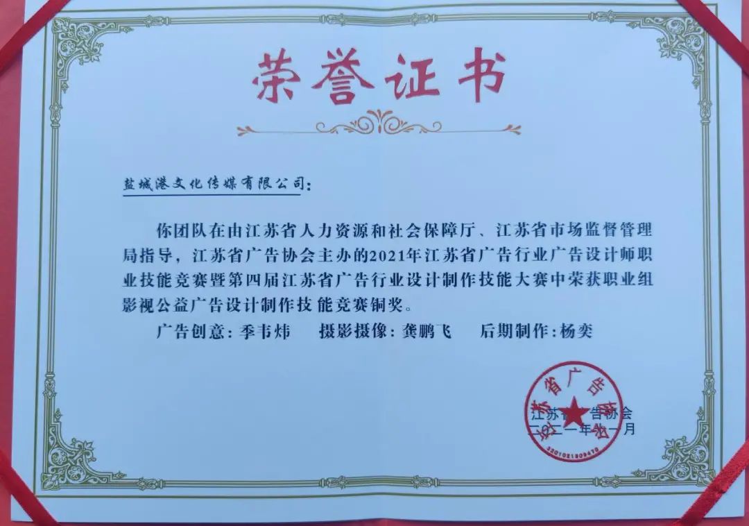 11月28日,從2021年江蘇省廣告行業廣告設計師職業技能競賽暨第四屆設計制作技能大賽上傳來好消息,由江蘇鹽城港文化傳媒有限公司選送的參賽選手,經過現場理論、實際創作等環節的比拼,在此次省級一類大賽中分別獲得職業組平面公益廣告設計銅獎、職業組影視公益廣告設計制作銅獎,為公司進一步提升品牌影響力增添了濃墨重彩的一筆,為“50天大比武活動”交上了一份優異的答卷。