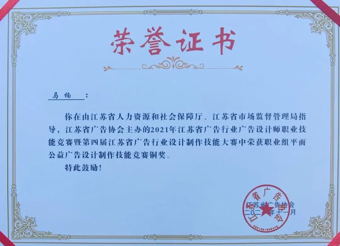 此次大賽是第四屆江蘇省百萬技能人才技能競賽崗位練兵活動其中一項重要賽事,由江蘇省人力資源和社會保障局、江蘇省市場監督管理局、江蘇省廣告協會聯合舉辦,以“永遠跟黨走”競賽主題,內容包含廣告專業理論知識考試和技能實操競賽,來自全省各市區130多支代表隊參加角逐。其中,文化傳媒公司5名參賽選手在理論知識考試和技能實操競賽成績中取得優異成績,均獲得三級廣告設計師職業技能等級證書。