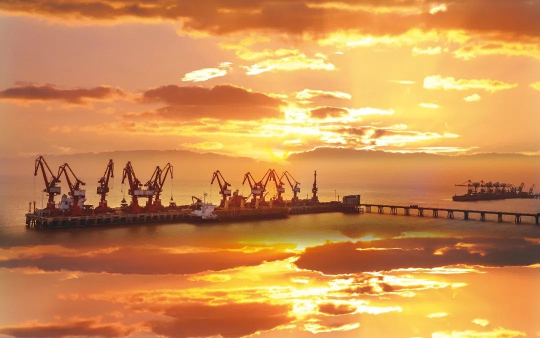 海平面上,太陽冉冉升起,映紅了海面和天空,照耀著海港的迷人和神奇,新興和璀璨。
