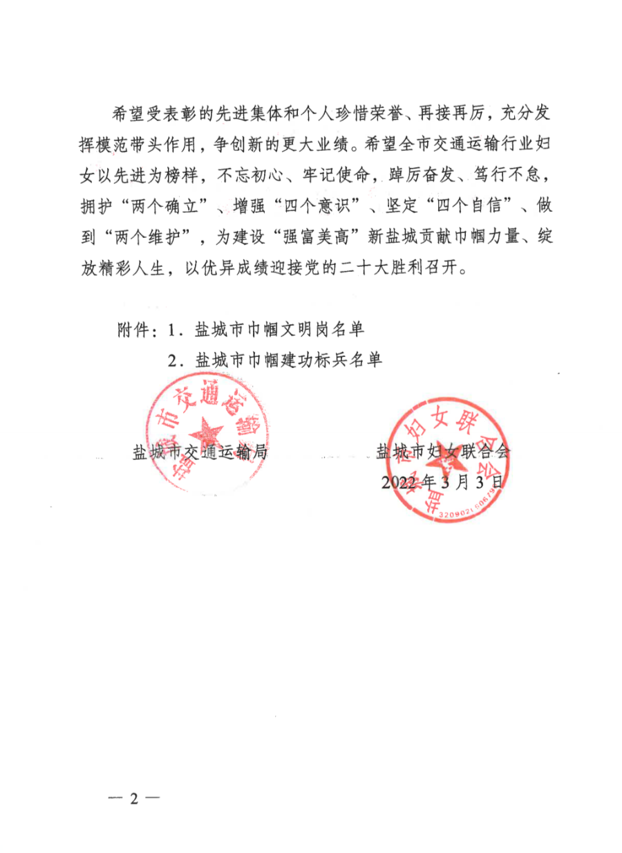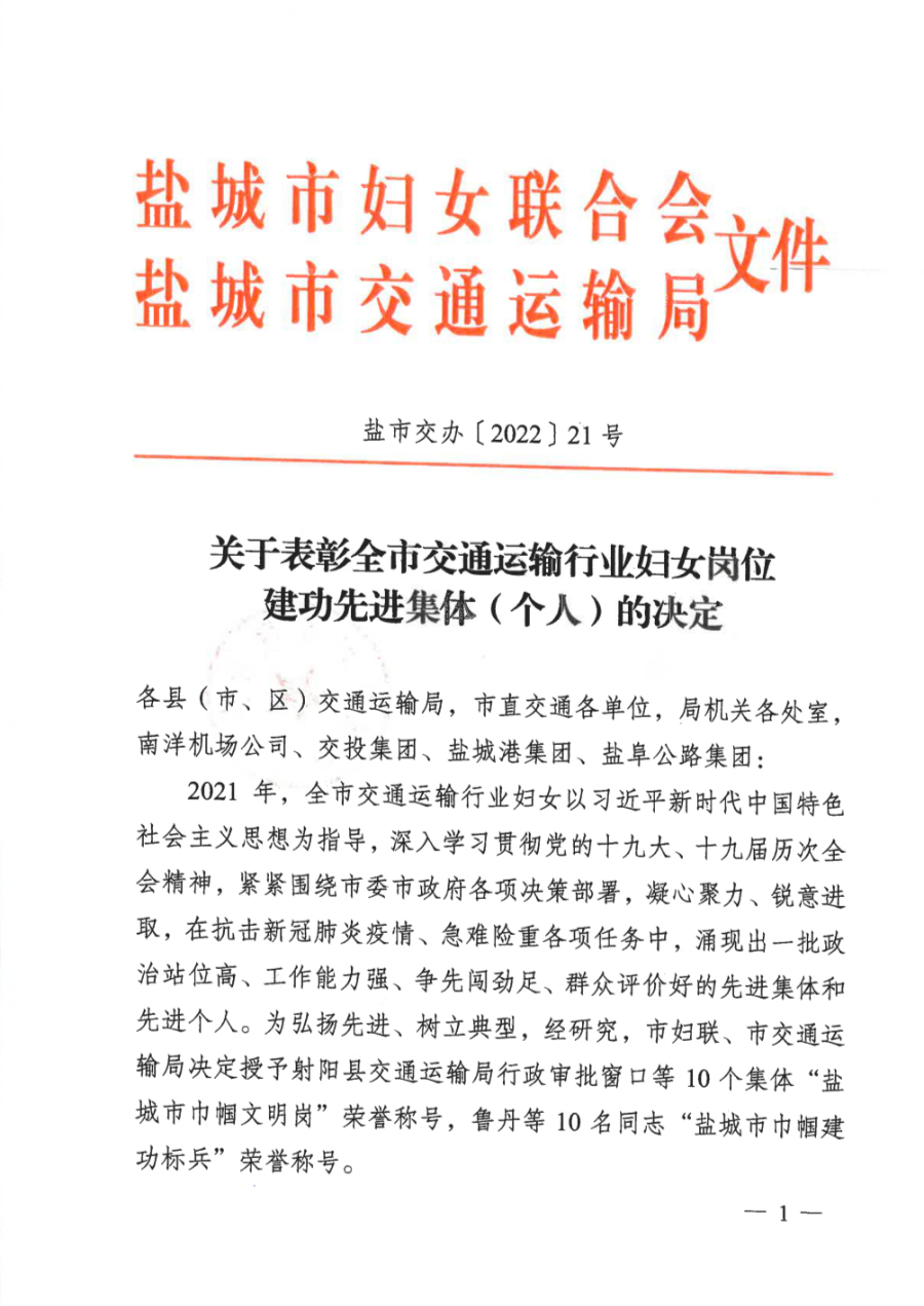 近日,市婦聯、市交通運輸局聯合發布《關于表彰全市交通運輸行業婦女崗位建功先進集體(個人)的決定》,鹽城港港口公司“海燕”班組榮獲“鹽城市巾幗文明崗”榮譽稱號。
