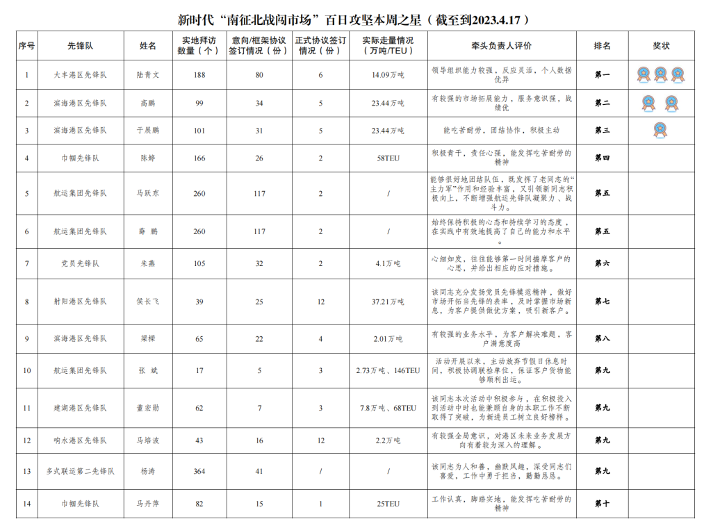 第一名:大豐港區先鋒隊 陸青文(拜訪客戶188家,簽訂意向協議80份,簽訂正式協議6份,實際走量14.09萬噸)