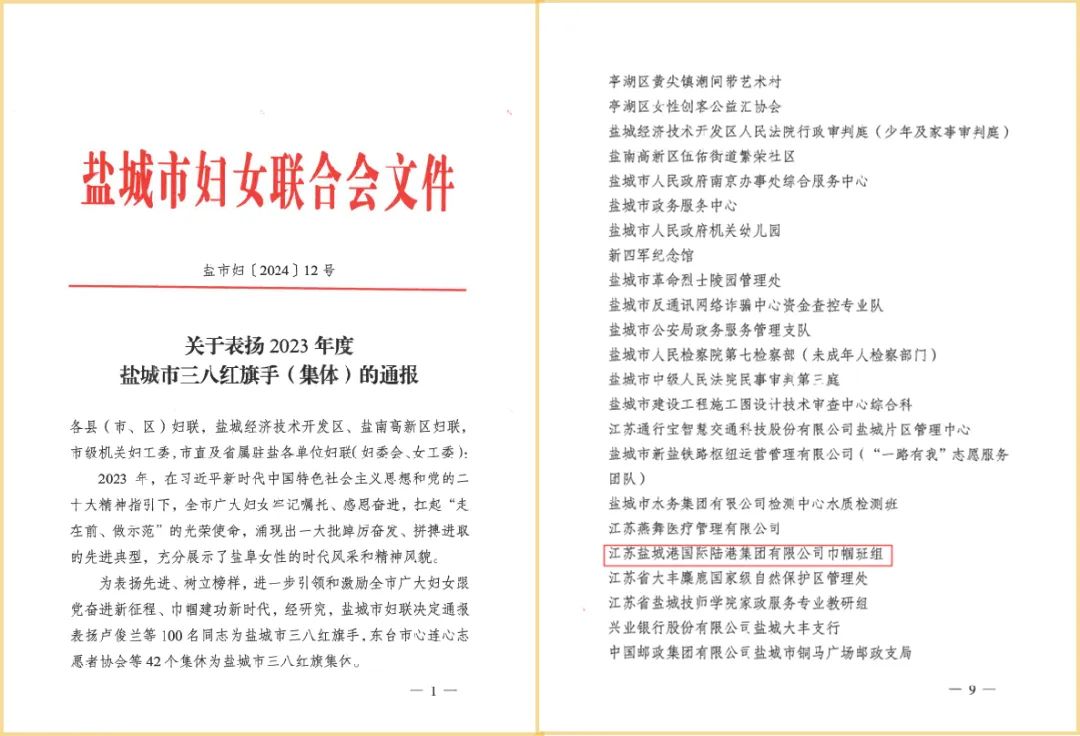 近日,鹽城市婦女聯合會發布《關于表揚2023年度鹽城市三八紅旗手(集體)的通報》,江蘇鹽城港國際陸港集團有限公司巾幗班組被評為“2023年度鹽城市三八紅旗集體”。