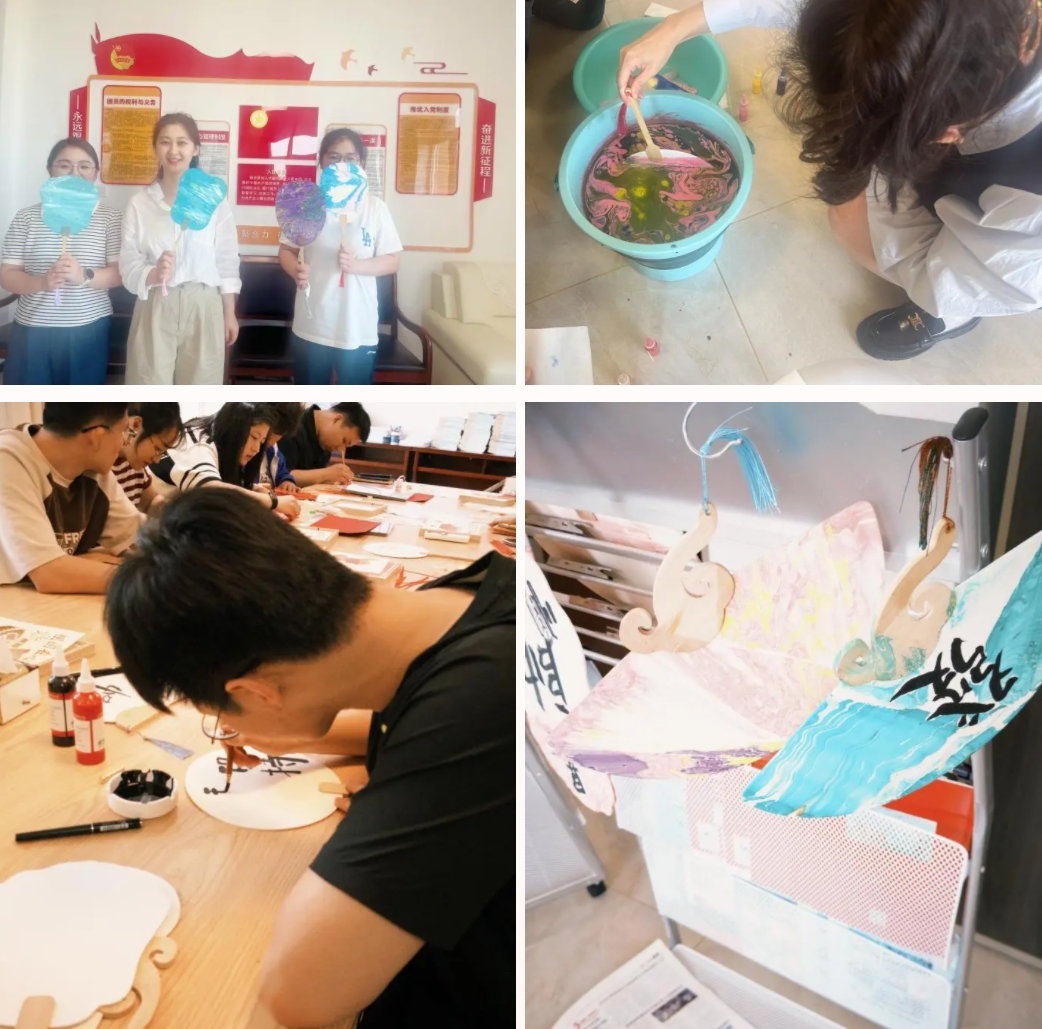 為青年們講述了漆扇的悠久歷史與在華夏藝術(shù)殿堂中璀璨奪目的地位,示范了漆扇制作那繁復(fù)而精妙的步驟,從選材到上漆,每一步都透露著對(duì)美的極致追求。活動(dòng)中,青年們充分發(fā)揮創(chuàng)意與想象,將精心調(diào)配的顏料緩緩滴入清澈的水中,隨后以輕盈的手法攪動(dòng)水面,顏料在水中緩緩擴(kuò)散,形成一幅幅流動(dòng)的畫卷,或清新淡雅,或濃墨重彩,那流云般變幻莫測(cè)的紋理,是自然與藝術(shù)的完美邂逅,更是青年們傳達(dá)著對(duì)祖國(guó)的愛(ài)意。