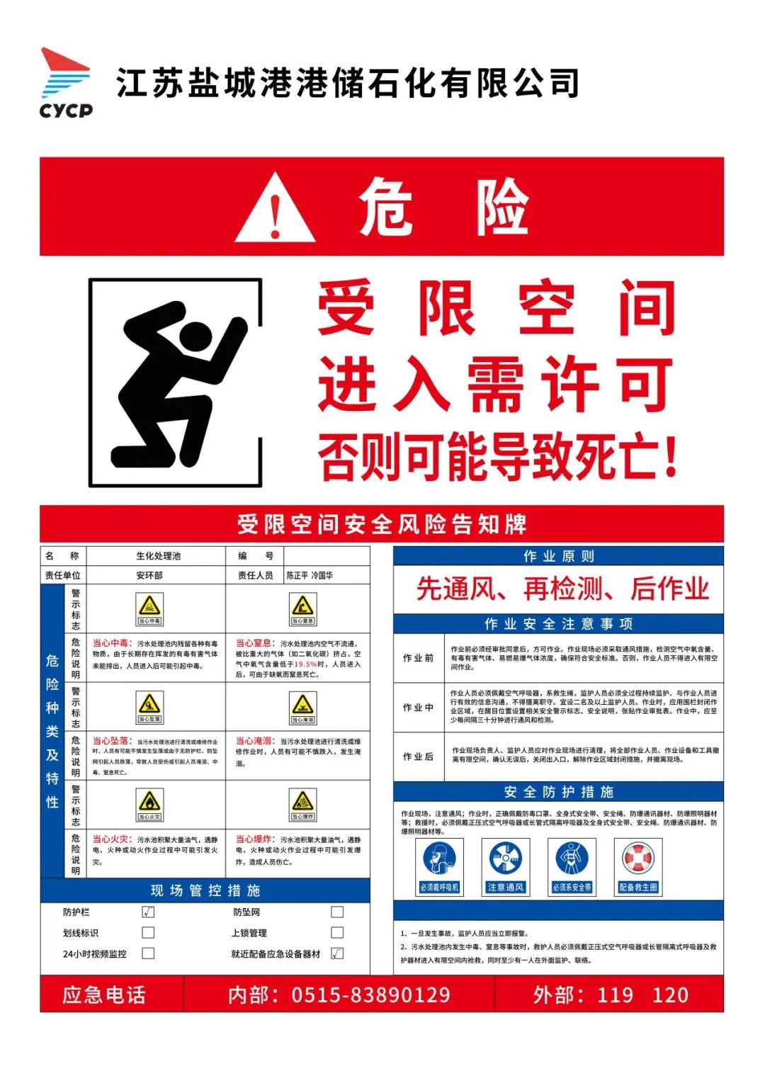 ????作業(yè)現(xiàn)場(chǎng)必須配備呼吸器、通訊器材、安全繩索等防護(hù)設(shè)施和應(yīng)急裝備。作業(yè)現(xiàn)場(chǎng)必須配備監(jiān)護(hù)人員,與作業(yè)人員有效溝通,方便及時(shí)實(shí)施救助。