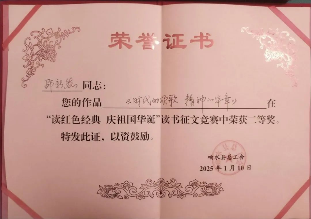 近日,由響水縣總工會舉辦的2024年度“讀紅色經(jīng)典、慶祖國華誕”職工讀書征文競賽活動結(jié)果相繼公布,江蘇響水港物流有限公司業(yè)務組邵新然的《時代的頌歌,精神的華章》在眾多作品中脫穎而出,榮獲征文競賽二等獎。