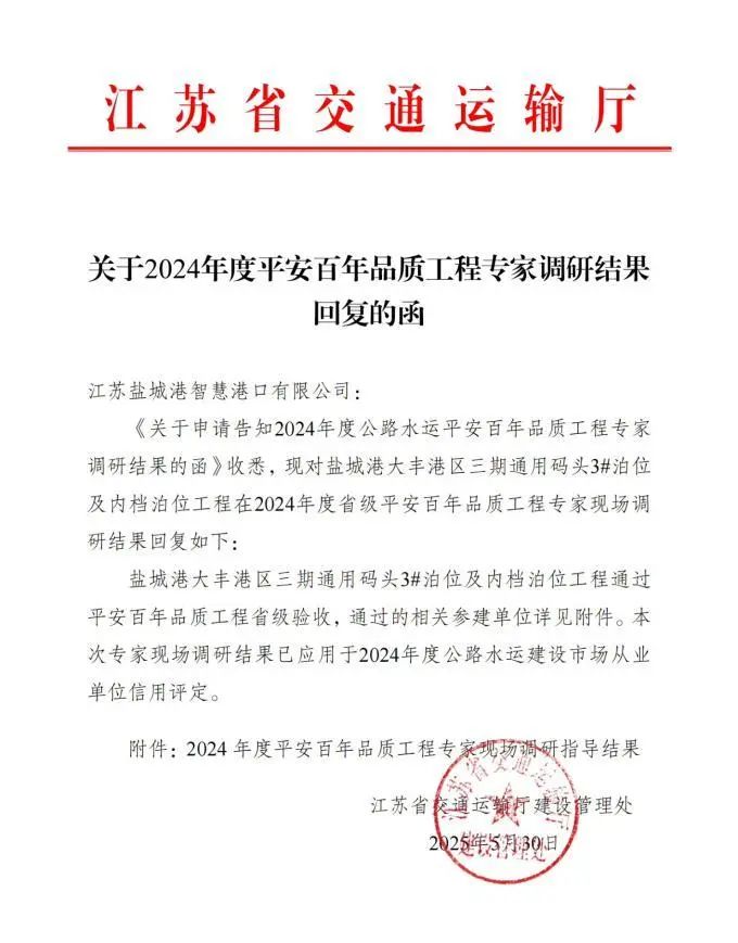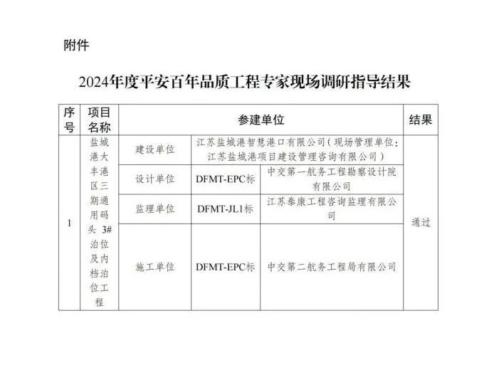 近日,省交通運(yùn)輸廳公布2024年度“平安百年品質(zhì)工程”專家現(xiàn)場(chǎng)調(diào)研指導(dǎo)結(jié)果,鹽城港大豐港區(qū)三期通用碼頭3#泊位及內(nèi)檔泊位工程成功通過(guò),標(biāo)志著鹽城港在省級(jí)“品質(zhì)工程”創(chuàng)建領(lǐng)域取得了歷史性突破。