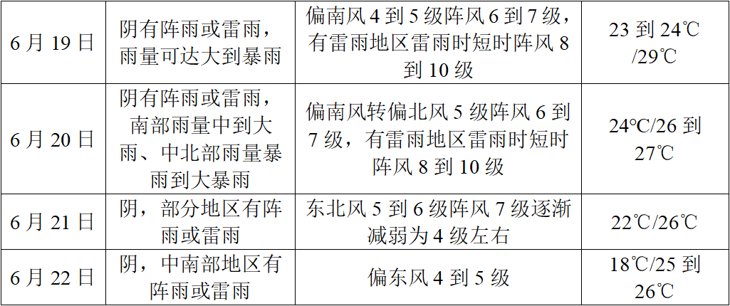 19-22日過(guò)程雨量:80~150毫米,局部180~220毫米,雨量主要集中在19-20日,21日雨帶逐漸南壓,22日降水主要在中南部地區(qū)。降雨期間局地可能伴有雷電、小時(shí)雨強(qiáng)40~70毫米的短時(shí)強(qiáng)降水和8~10級(jí)雷暴大風(fēng)等強(qiáng)對(duì)流天氣。