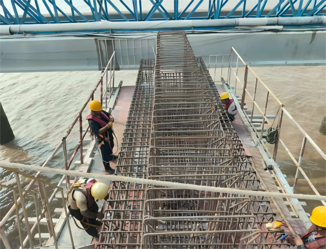 走進糧食碼頭新建泊位及配套設施項目工地,施工人員正頂著烈日進行引橋混凝土澆筑作業。“我們從項目開工就立下了‘進度不滯后、質量不打折’的軍令狀?!表椖控撠熑私榻B,為確保工程按計劃推進,團隊早在開工初期就聯合施工單位、監理部門制定了詳細的施工計劃,將工期細化到每周、每日,通過“倒排工期”的方式壓實責任。針對沿海地區夏季多臺風、暴雨的特點,碼頭建立了一套“預警——響應——切換”的應急管理體系。這種提前備好應急預案、快速切換施工安排的模式,為工程穩步推進筑起了“防護墻”。
