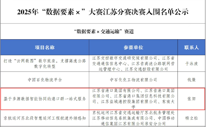 近日,2025年“數(shù)據(jù)要素×”大賽江蘇分賽決賽入圍名單公示,由省港口集團(tuán)、鹽城港集團(tuán)、東南大學(xué)聯(lián)合申報的《基于多源數(shù)據(jù)智能協(xié)同的港口群一站式服務(wù)》項目,成功入圍2025年“數(shù)據(jù)要素×”大賽江蘇分賽決賽。