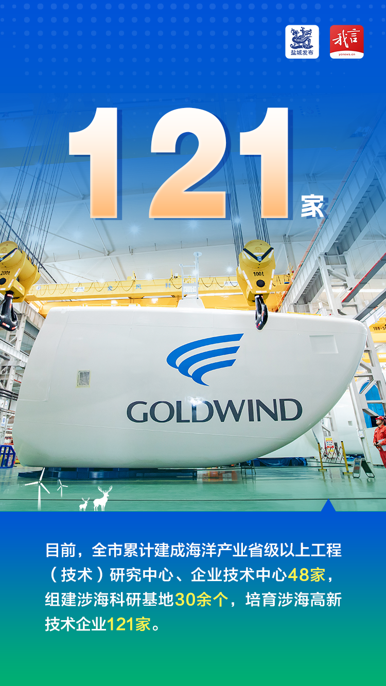 鹽城綠色低碳科創園不斷集聚涉海科創資源,其中江蘇沿海可再生能源技術創新中心獲批省級技術創新中心,江蘇海洋經濟技術研究院投入運營,藍色種業黃海實驗室建設持續推進。目前,全市累計建成海洋產業省級以上工程(技術)研究中心、企業技術中心48家,組建涉海科研基地30余個,培育涉海高新技術企業121家。