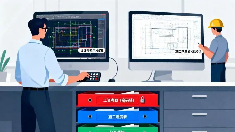 資料分好“保密等級”:重要的圖紙別誰都能看,比如只有設計師能打開帶尺寸的詳細圖,施工隊看簡化版就行;工人的考勤數據、工資信息單獨存,設密碼鎖,別和施工進度表混在一起。