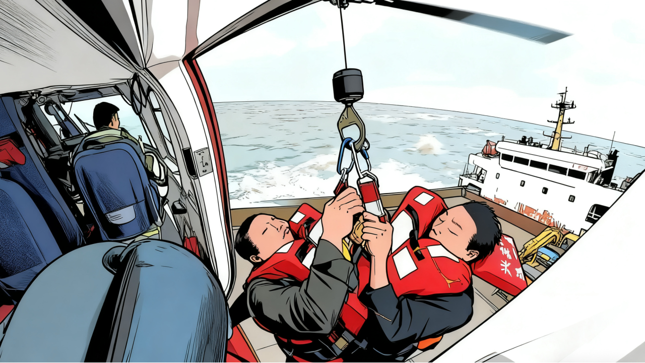 2022年12月11日,受寒潮大風(fēng)影響,在廣東珠海擔(dān)桿島附近海域,一艘貨船遭遇風(fēng)浪失去動力,觸礁進水?dāng)R淺,船上3人棄船求救。遇險3人被救助直升機救起。