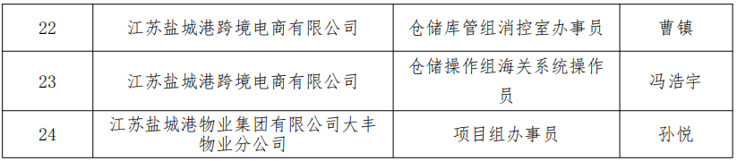 根據(jù)2024年7月7日發(fā)布的《江蘇鹽城港控股集團(tuán)有限公司招聘公告》相關(guān)程序規(guī)定,現(xiàn)對24名擬錄用工作人員進(jìn)行公示(另外江蘇鹽城港拖輪服務(wù)有限公司船管組辦事員崗位擬聘人員均自愿放棄)。
