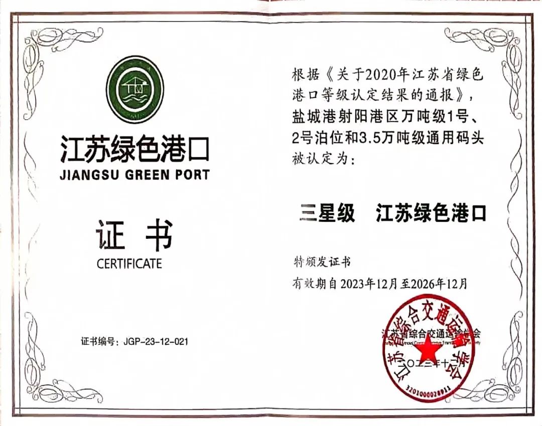 濱海港區(qū)獲得“江蘇省三星級綠色港口”榮譽稱號