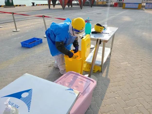本次演練模擬了濱海港區(qū)通用碼頭2號泊位發(fā)現(xiàn)疫情之后的相關(guān)處置流程。演練中,碼頭發(fā)現(xiàn)疫情后,及時將情況進行上報,并立即停止作業(yè),同時迅速對登船人員進行排查,就地隔離,開展現(xiàn)場消殺工作。現(xiàn)場成立疫情防控應(yīng)急指揮部,按照指揮部的統(tǒng)一調(diào)度,開展應(yīng)急處置,經(jīng)過妥善處理,演練中的疫情得到有效控制,同時對碼頭作業(yè)人員嚴格執(zhí)行“N+7+7”的閉環(huán)管理,確保濱海港區(qū)碼頭盡快恢復(fù)正常生產(chǎn)。
