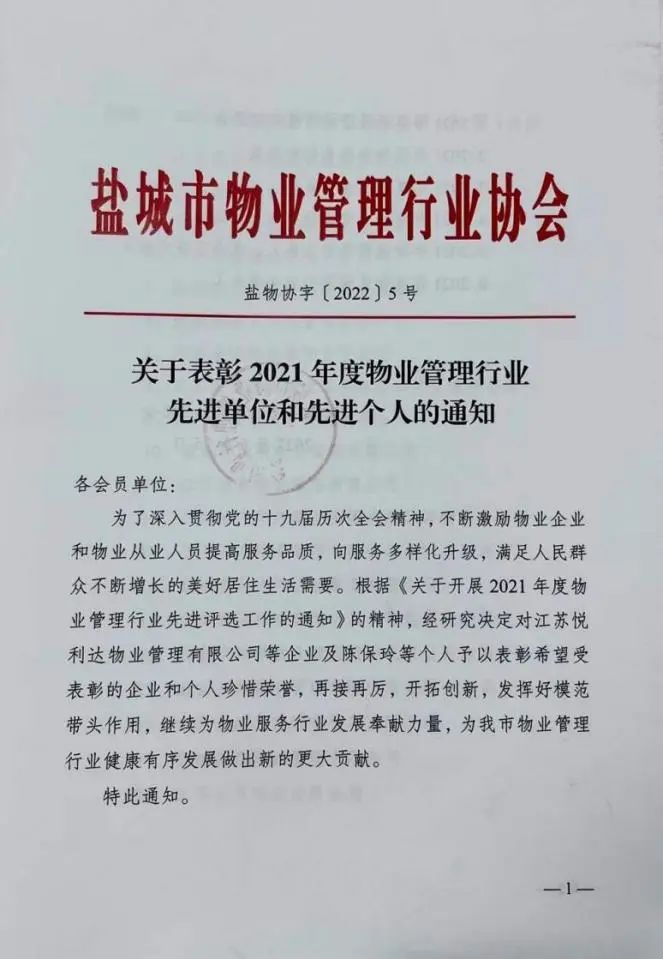 近日,鹽城市物業(yè)管理行業(yè)協(xié)會對全市物業(yè)管理行業(yè)先進單位和先進個人進行了表彰,江蘇鹽城港物業(yè)集團有限公司獲評“2021年度物業(yè)管理行業(yè)先進單位”榮譽稱號。