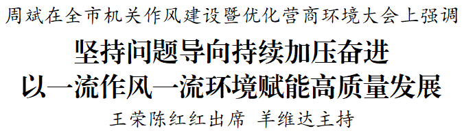 周斌指出,黨的十八大以來,以習近平同志為核心的黨中央高度重視干部作風和營商環(huán)境建設,反復強調作風建設永遠在路上,只有進行時沒有完成時;深刻指出“好的營商環(huán)境就像陽光、水和空氣,須臾不能缺少”。全市上下要切實增強責任感、緊迫感,深刻認識轉作風、優(yōu)環(huán)境是扛起新使命的關鍵之舉,是競逐新賽道的必由之路,是展現新作為的應有之義,必須把機關作風建設和優(yōu)化營商環(huán)境擺在更加突出位置,對照“軍令狀”,落實“施工圖”,畫好“工筆畫”,全力攻堅突破、爭先進位,嚴格督查考核,以永遠在路上的恒心,一步一個腳印矢志鍛造一流作風、營造一流環(huán)境、創(chuàng)造一流業(yè)績。