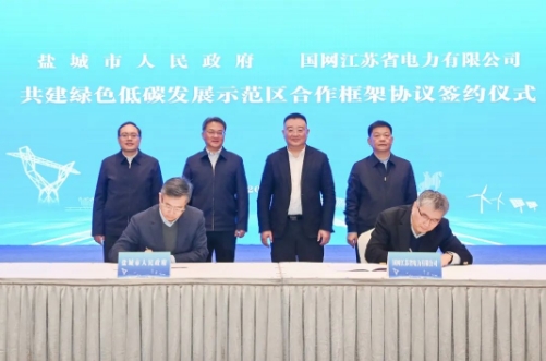 1月4日,鹽城市政府與國網(wǎng)江蘇省電力有限公司簽署共建綠色低碳發(fā)展示范區(qū)合作框架協(xié)議。市委書記周斌,市委副書記、市長張明康會(huì)見國網(wǎng)江蘇電力董事長謝永勝一行,并共同見證簽約。