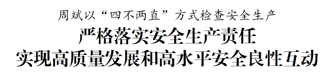 周斌在調研中強調,安全生產工作須臾不可懈怠、絲毫不可放任、時刻不可松勁。各地各部門要進一步抬高政治站位,堅持黨政同責、一崗雙責、齊抓共管、失職追責,全面推進安全生產治本攻堅三年行動,做到主動發現問題、及時解決問題,不斷提升本質安全水平,保障人民群眾生命財產安全,為勇當發展新質生產力重要陣地“碳路先鋒”提供有力支撐。