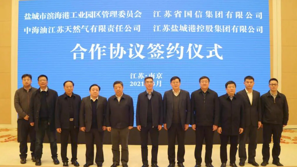 3月2日,濱海港工業園區、省國信集團、中海油江蘇天然氣公司、鹽城港集團在南京簽訂四方合作協議。市委常委、濱海縣委書記、濱海港工業園區黨委書記孫軼出席簽約儀式。集團黨委書記、董事長、總經理周正雄與三家合作單位相關負責同志共同簽訂《合作協議》。